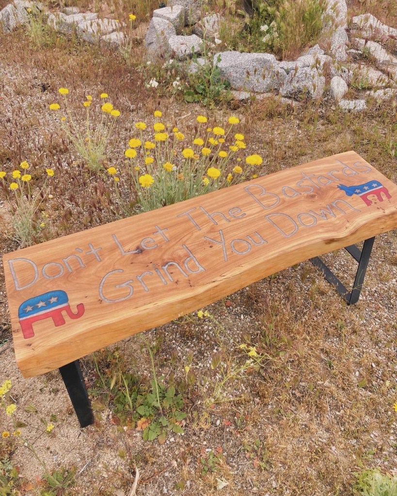 White Ash Slab bench, Routed Letters and Images, RWB resin and industrial legs