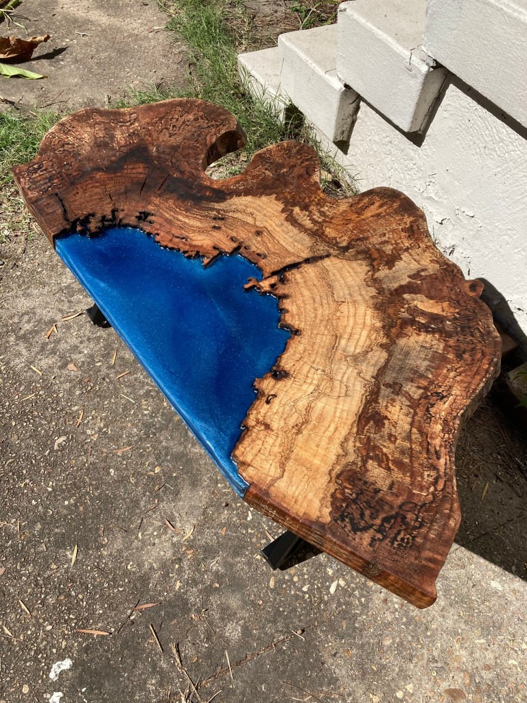Oak Heartwood Cookie, Delft blue resin, shellac seal, deluxe industrial legs
