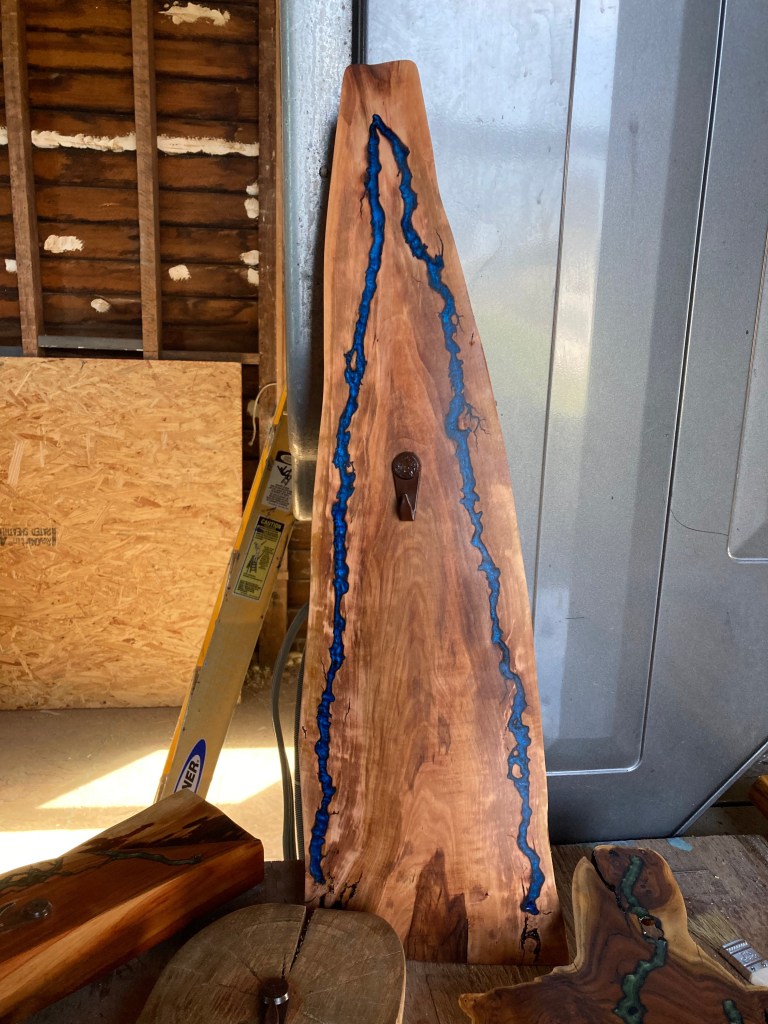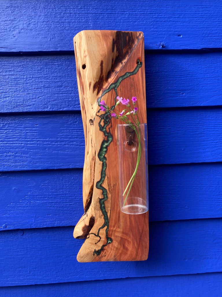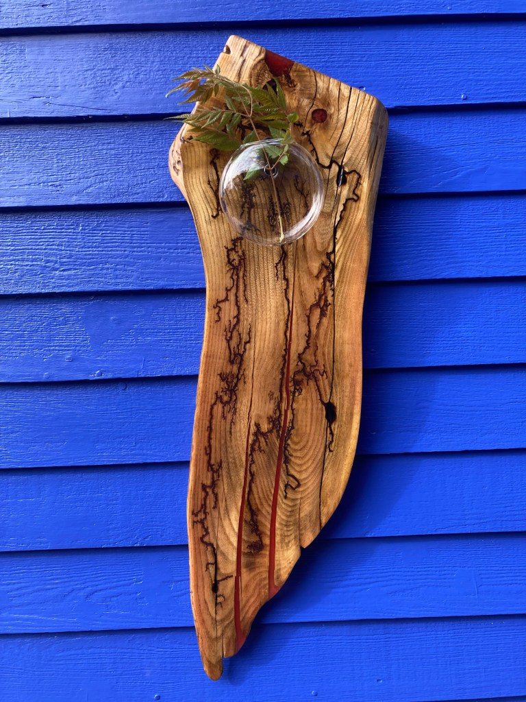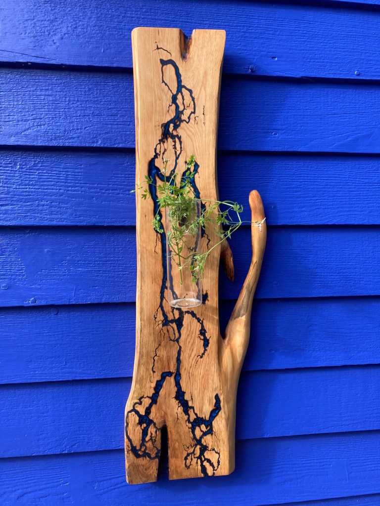 White Ash slab with Lichtenberg burning, Azure resin fill, shellac seal and plant propagation bulb.