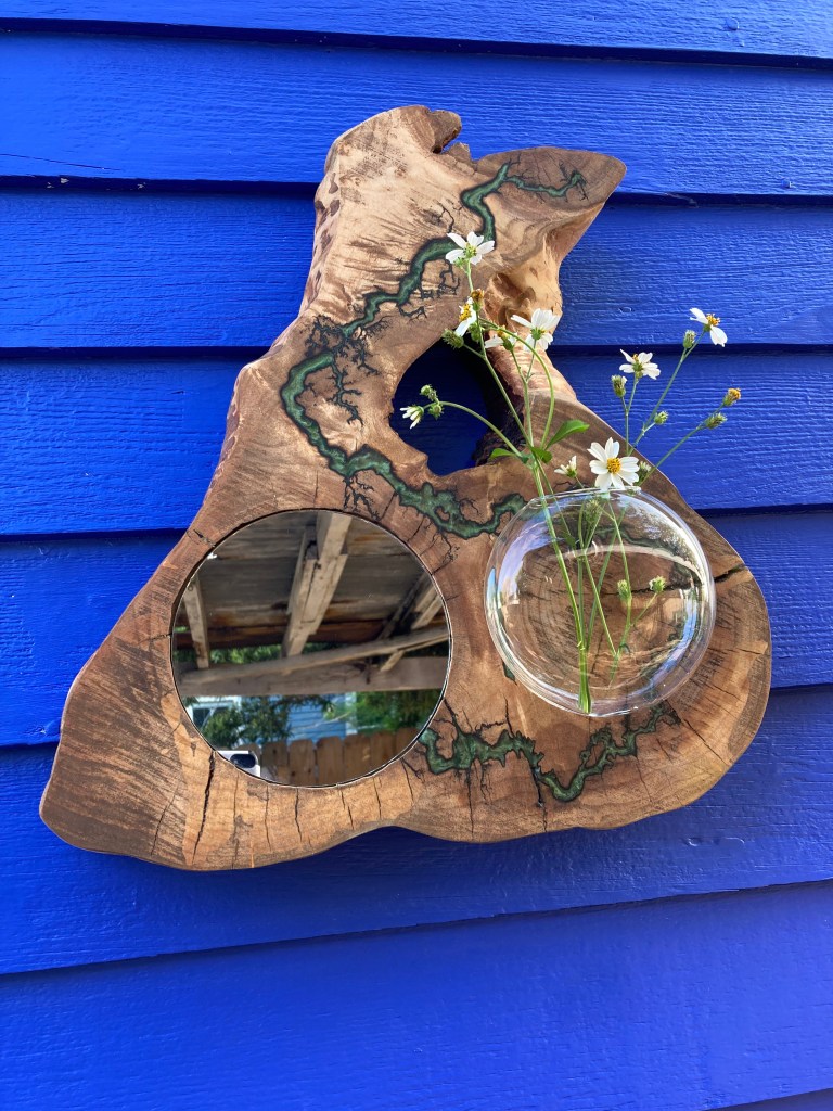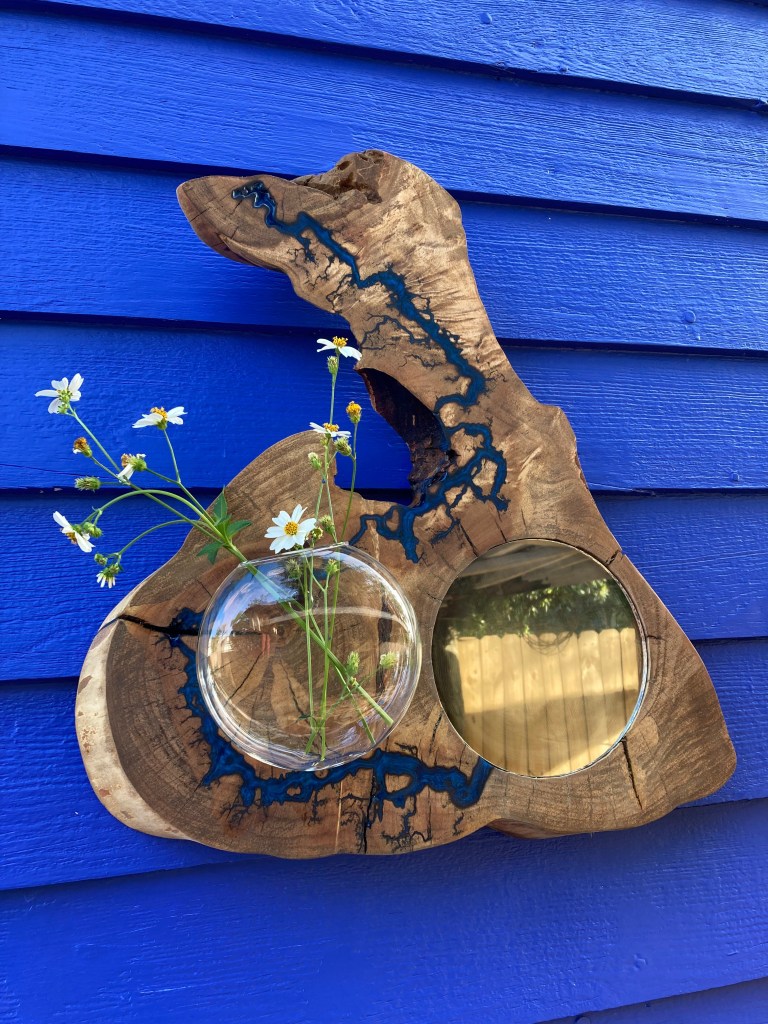 Cottonwood offcut with Lichtenberg burning, Pacific Blue resin fill, inlaid mirror and plant propagation globe