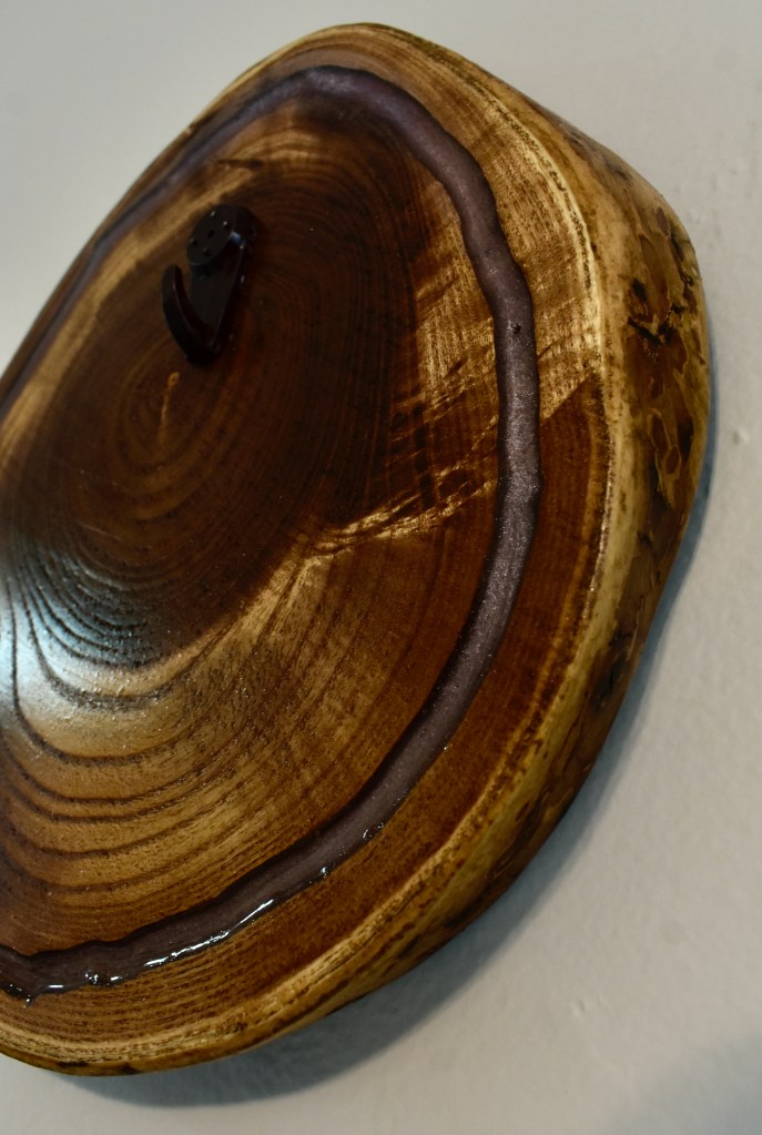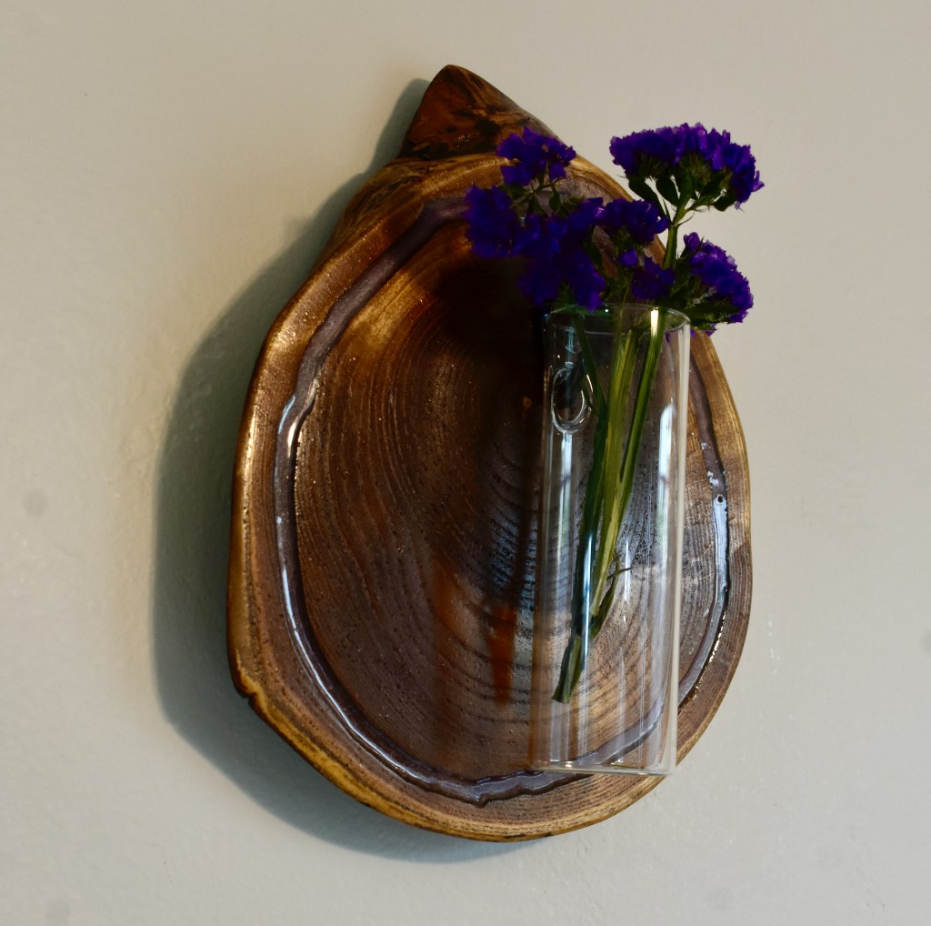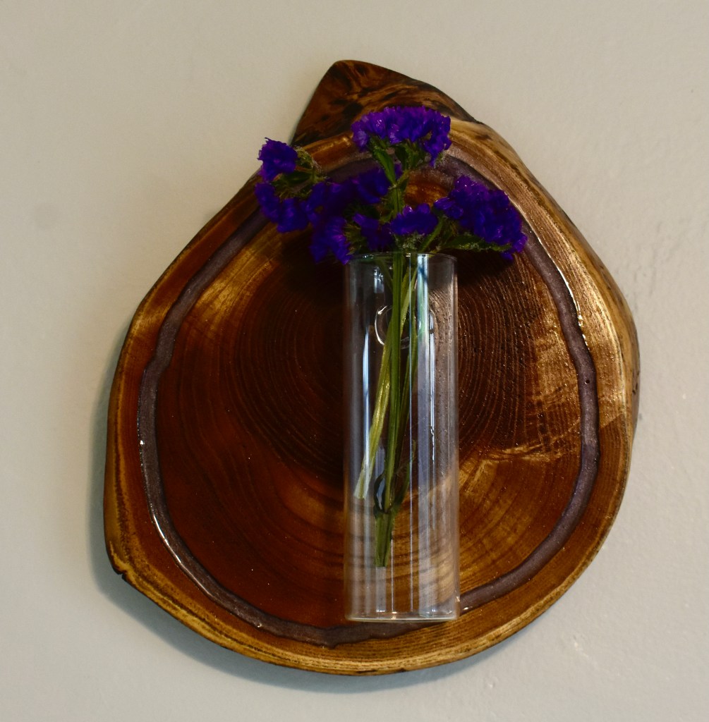 A live-edge slice with an inlaid ring of lavender resin. Ideal for propagating plants. Includes pre-attached wall hanger and propagation bulb.