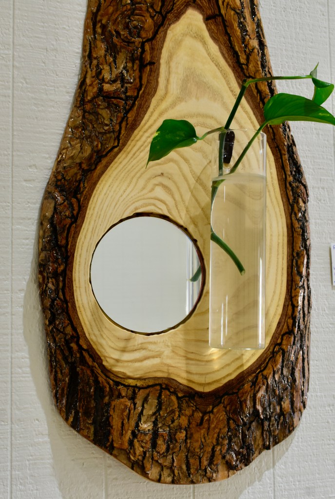 Salvaged knuckle slab with electro-formed textures, resin-sealed with inset mirror and propagation cylinder.