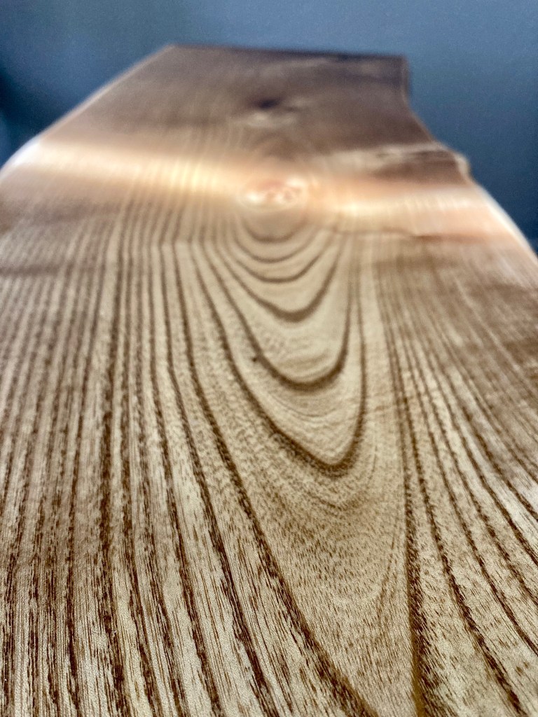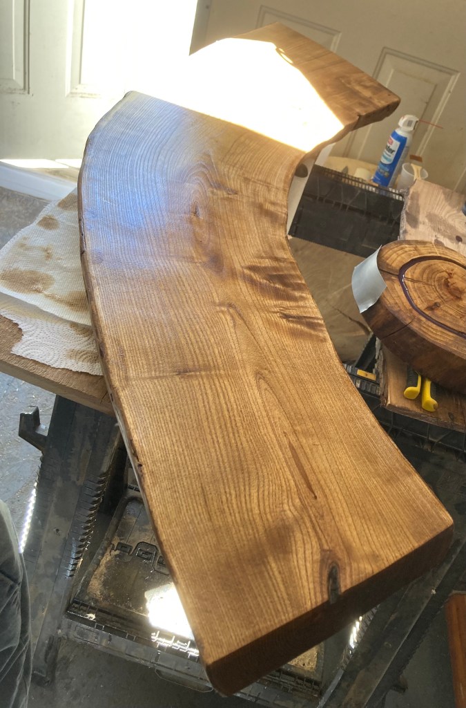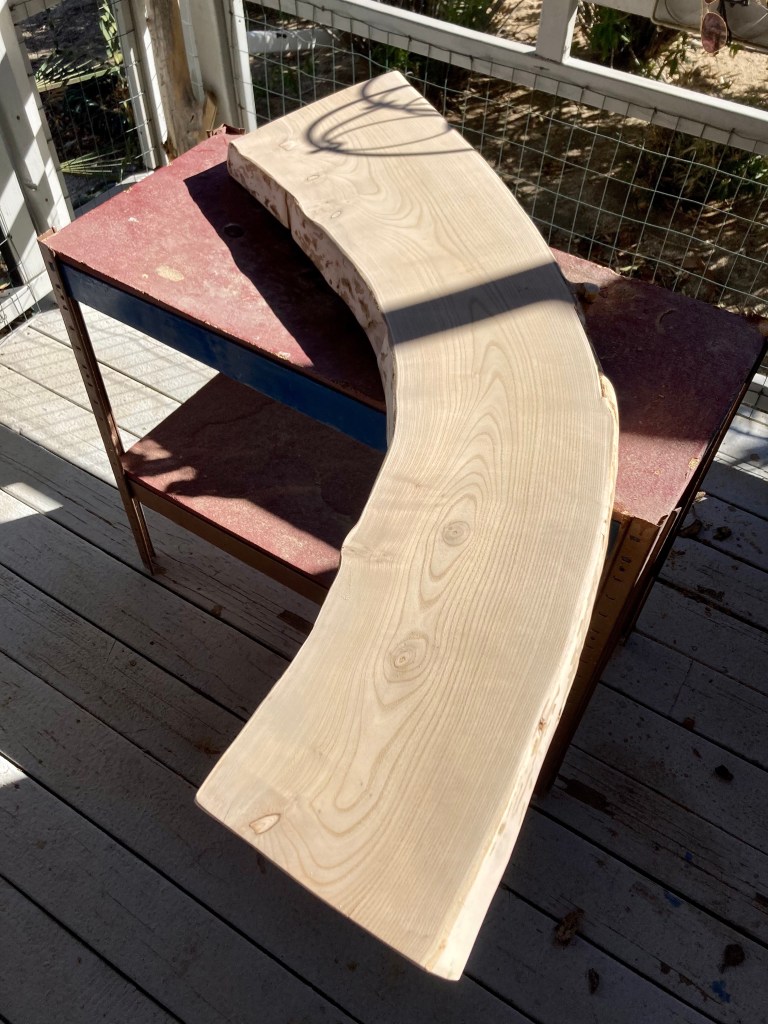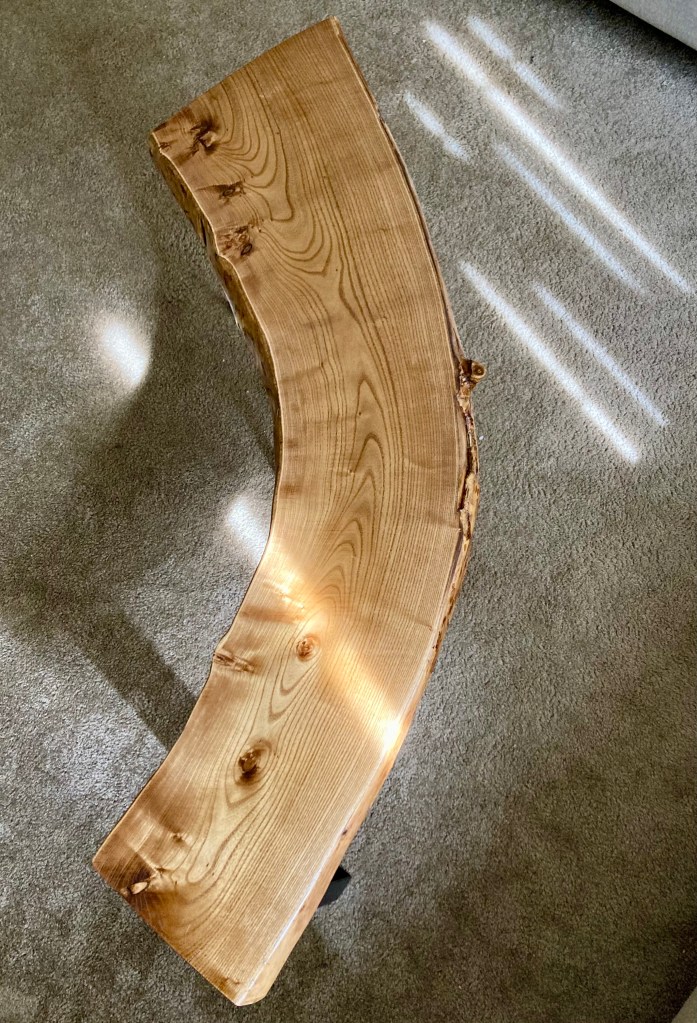 Natural curved bench with three black metal legs – perfect for corners and bay windows (Two matching benches available as a pair for $600).
